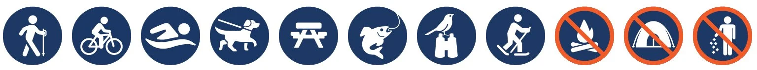 The public is welcome to enjoy the beach and trails during daylight hours only. Boating, swimming, fishing, walking, cross-country skiing, and snowshoeing are permitted.