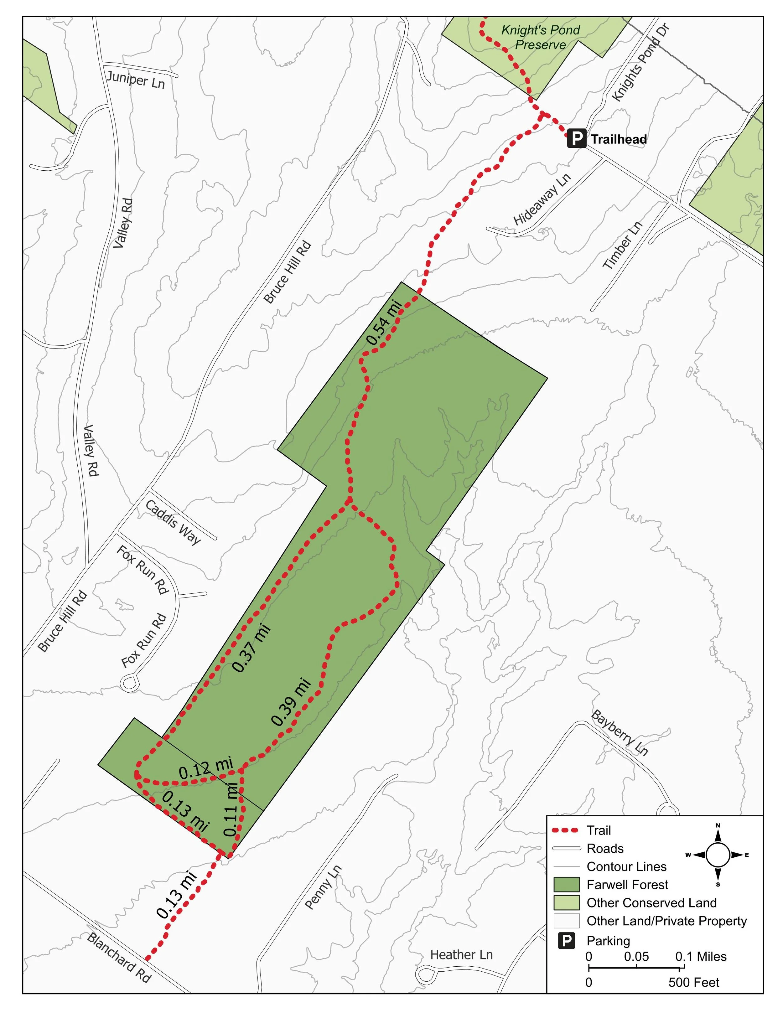 Farwell Forest lies between Blanchard Road and Knight’s Pond Preserve (Greely Road Extension) in Cumberland. Limited parking is available at the end of Greely Road Extension (see Google map below). Please be sure not to block the driveway to the house at the end of the road. If this area is full, visitors can park at the main Knight’s Pond parking lot and walk up Greely Road Extension to the trail at the end of the road. The property is also accessible (but there is no parking) from Blanchard Road along a right-of-way on the northeast side of Blanchard Road about 3/10 mile southeast of the intersection with Bruce Hill Road. The right-of-way follows the southeastern edge of a large field before linking to the trail network on the protected property.