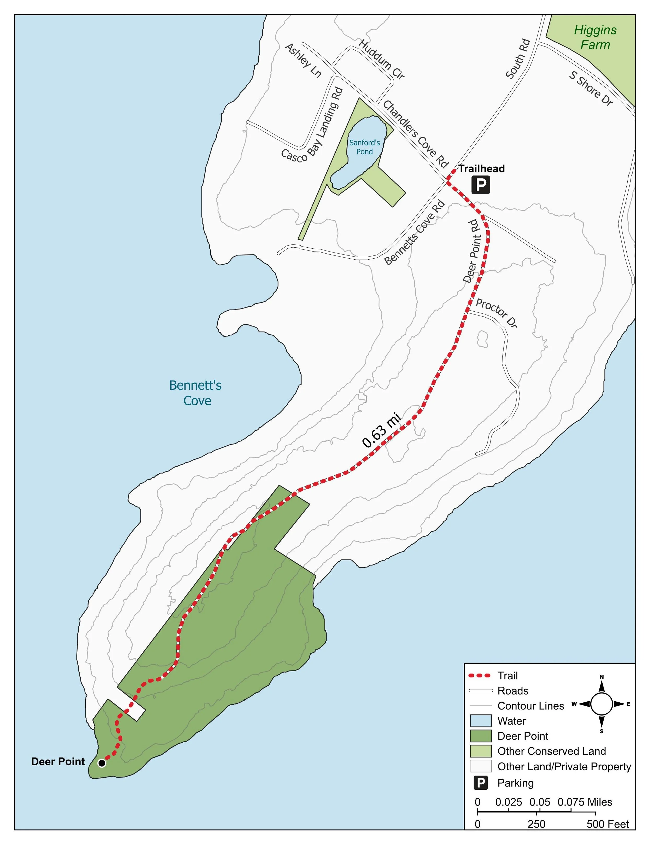 Heading down the dirt Deer Point Road, visitors can continue onto a trail through the woods to the rocky point overlooking the ocean. The trail is narrow, rugged, rocky, and uneven in some spots. There are often wet areas after precipitation. A bench is available for resting and admiring the expansive coastal view at the tip of the point.