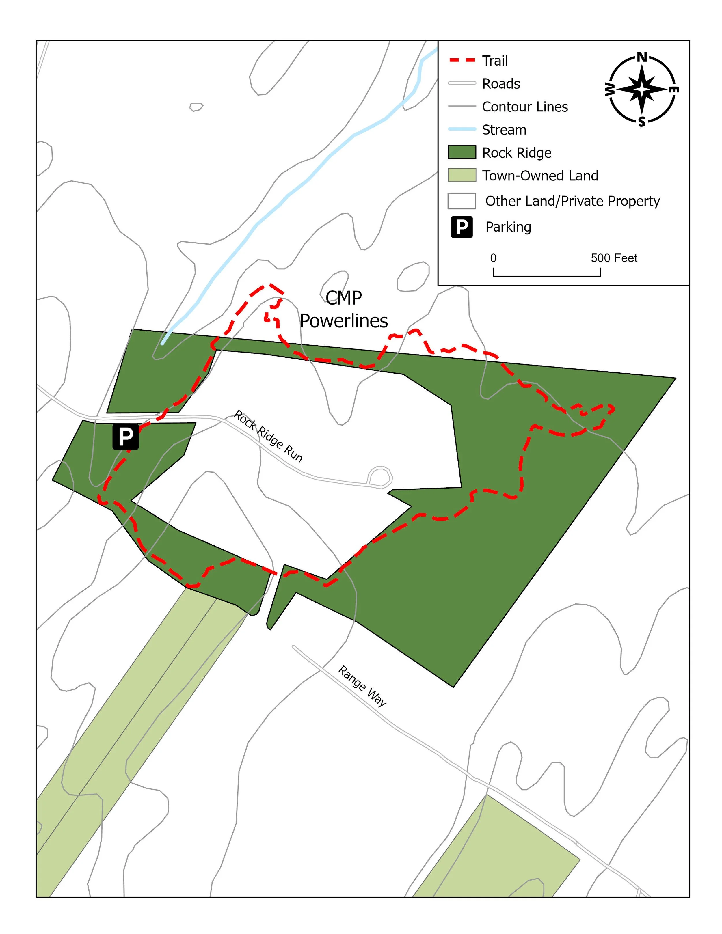 A trailhead and small parking area for Rock Ridge is located on Rock Ridge Run in Cumberland. Rock Ridge Run is off of Harris Road, roughly midway between Tuttle Road and Longwoods Road (see Google map below).