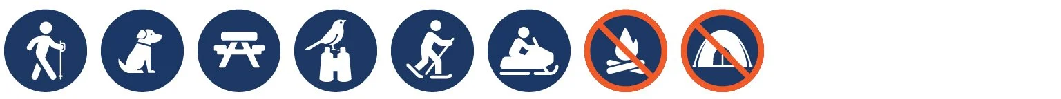 Visitors are welcome to explore the trails on foot, including hiking, running, cross-country skiing, and snowshoeing. Because of the proximity to homes, hunting is prohibited. Mountain bikes and motorized vehicles (except snowmobiles) are also prohibited. Snowmobiles are permitted only on the eastern portion of the property.
